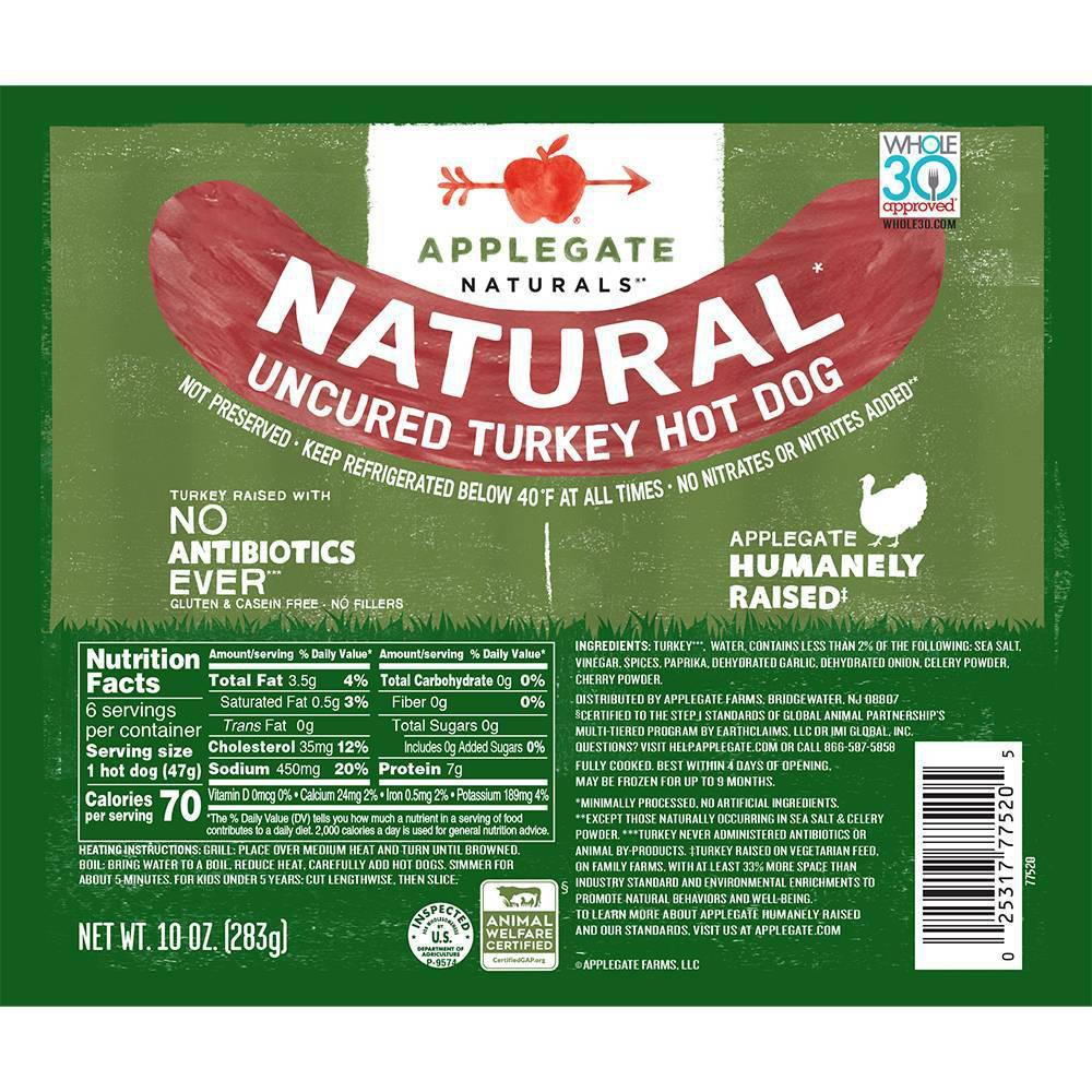 Enjoy the delicious taste of Applegate Natural Turkey Hot Dogs with this 6-count pack of uncured turkey hot dogs. Made with high-quality ingredients such as turkey, sea salt, vinegar, and a blend of spices, these hot dogs are free from artificial preservatives and additives. Perfect for grilling or heating up on the stovetop, these turkey hot dogs are a flavorful and healthier alternative to traditional hot dogs. Whether you're hosting a barbecue or looking for a quick and tasty meal, these Applegate Natural Turkey Hot Dogs are sure to satisfy your cravings.