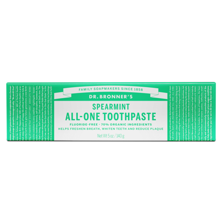 Dr. Bronner's All-One Toothpaste in Spearmint is a high-quality toothpaste that provides a long-lasting mellow-minty-fresh-clean feeling. Made with 70% organic ingredients, this fluoride-free and SLS-free toothpaste uses organic menthol crystals to naturally freshen breath. It also contains organic coconut flour and fair trade organic coconut oil to gently remove plaque and whiten teeth, while organic aloe helps soothe gums. This toothpaste is vegan and cruelty-free, and it does not contain any artificial colors or flavors, preservatives, synthetic sweeteners, or detergent foaming agents. With Dr. Bronner's All-One Toothpaste, you can trust that you are using a toothpaste that is both effective and environmentally friendly.